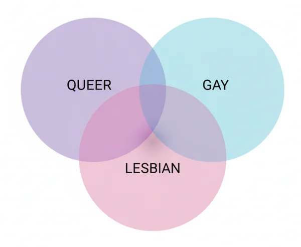 "Gay" usually refers to men attracted to men. "Lesbian" refers to women attracted to women. "Queer" is an umbrella term that includes both — plus bisexual, pansexual, non-binary, transgender, and other identities outside heterosexual and cisgender norms.